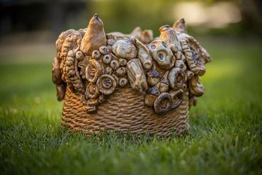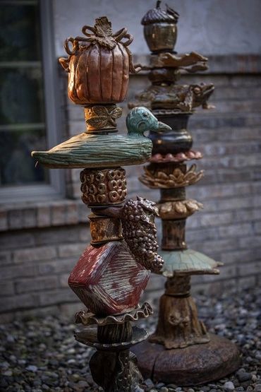 I always wanted to do pottery. Finally in my 50’s I started and have been at it for over 20 years. All my work is done at the Minnetonka Center For the Arts in Orono. The turtle was accepted into the Minnesota state fair competition and the rooster cookie jar only made it through the first round. I have worked on the wheel but prefer hand building. Earth tones and flat glazes are my definite preference. The totems have been very popular so many family members have them. At one time I did sell but not any more as I usually make one of a kind and keep them or just give away.